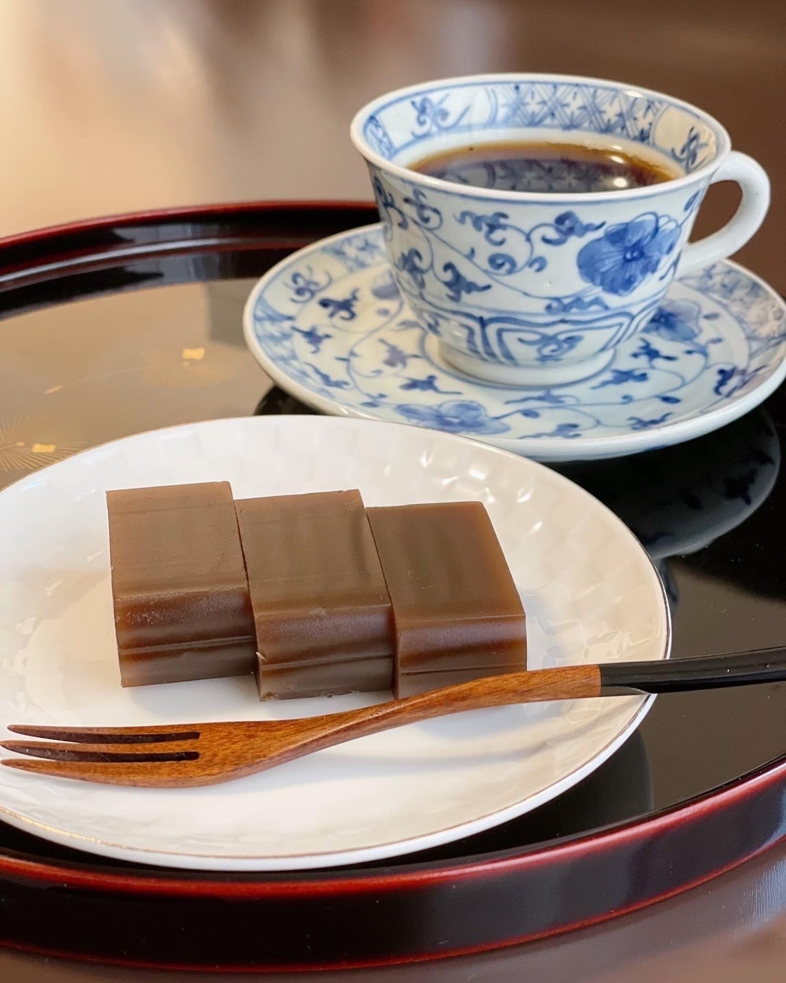コーヒーを白生餡に練り込んだ香り高い上品な珈琲羊羹です。コク深い味わい、深煎りのコーヒーを合わせると羊羹の甘さとの相性がよりお楽しみいただけます。